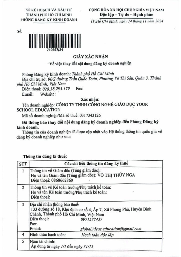 Quyết định cho phép thành lập Trung tâm giáo dục kỹ năng sống Công ty TNHH Công nghệ Giáo dục Your School Education